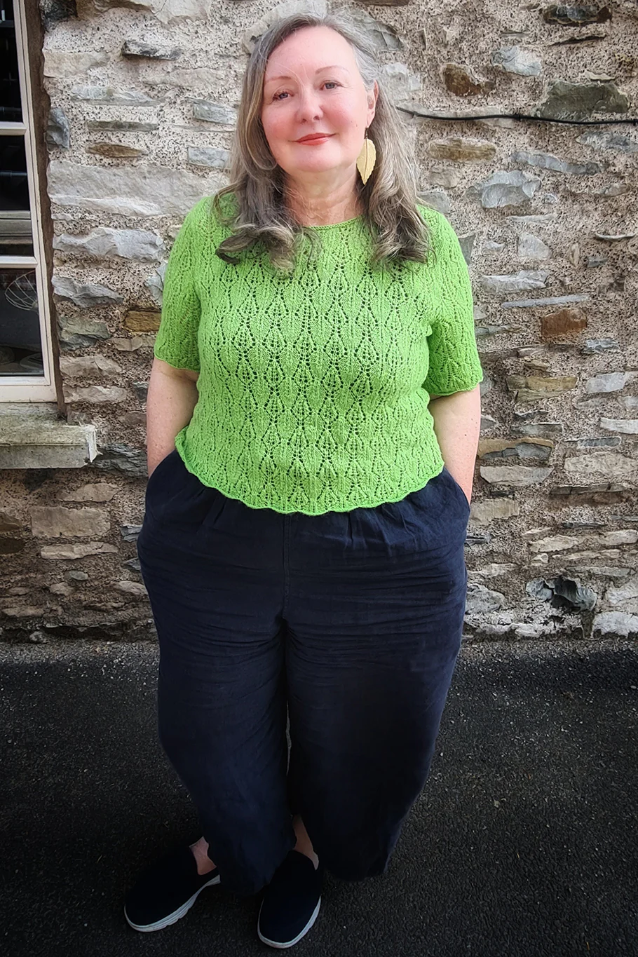 Amies is an elegant, t-shirt style top knitted in an all-over lace pattern. The simple lace stitch is easy to remember and intuitive to knit with every other row purled. Amies is knitted in flat pieces which are then sewn together and has a flattering round neckline and set-in sleeves. The lace pattern itself creates the softly scalloped finish to both the lower edge of the sweater and the sleeves for an extra feminine touch.
