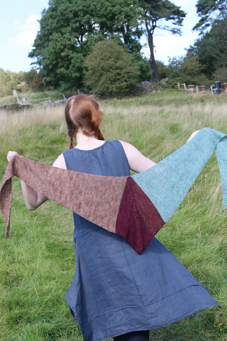 Anthriscus is a 'V' shaped shawl knit from tip to tip, starting at one end and increasing to the centre, then working a contrasting central section using short rows, then finally working decreases in a third colour to the opposite tip. When worn wrapped around the neck the first and third colours overlap whilst the remaining colour sits at the back. Wear it lots of different ways to see how the colours interact. When choosing your colours, you can play with contrasts or tones and even include a colour that you like but don't want to wear close to your face. The textural pattern is reminiscent of a linen stitch creating a fabric which looks good on both sides.