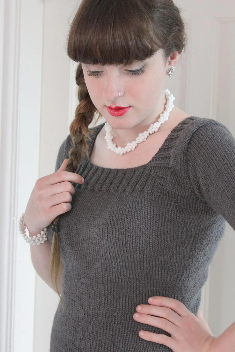 This figure hugging jumper is based on a classic 1950s silhouette with subtle waist shaping and a flattering square neckline. Knitted in DK weight yarn this is a quick and easy knit - providing you with the basic skills to knit jumpers and a great introduction to vintage style knits.