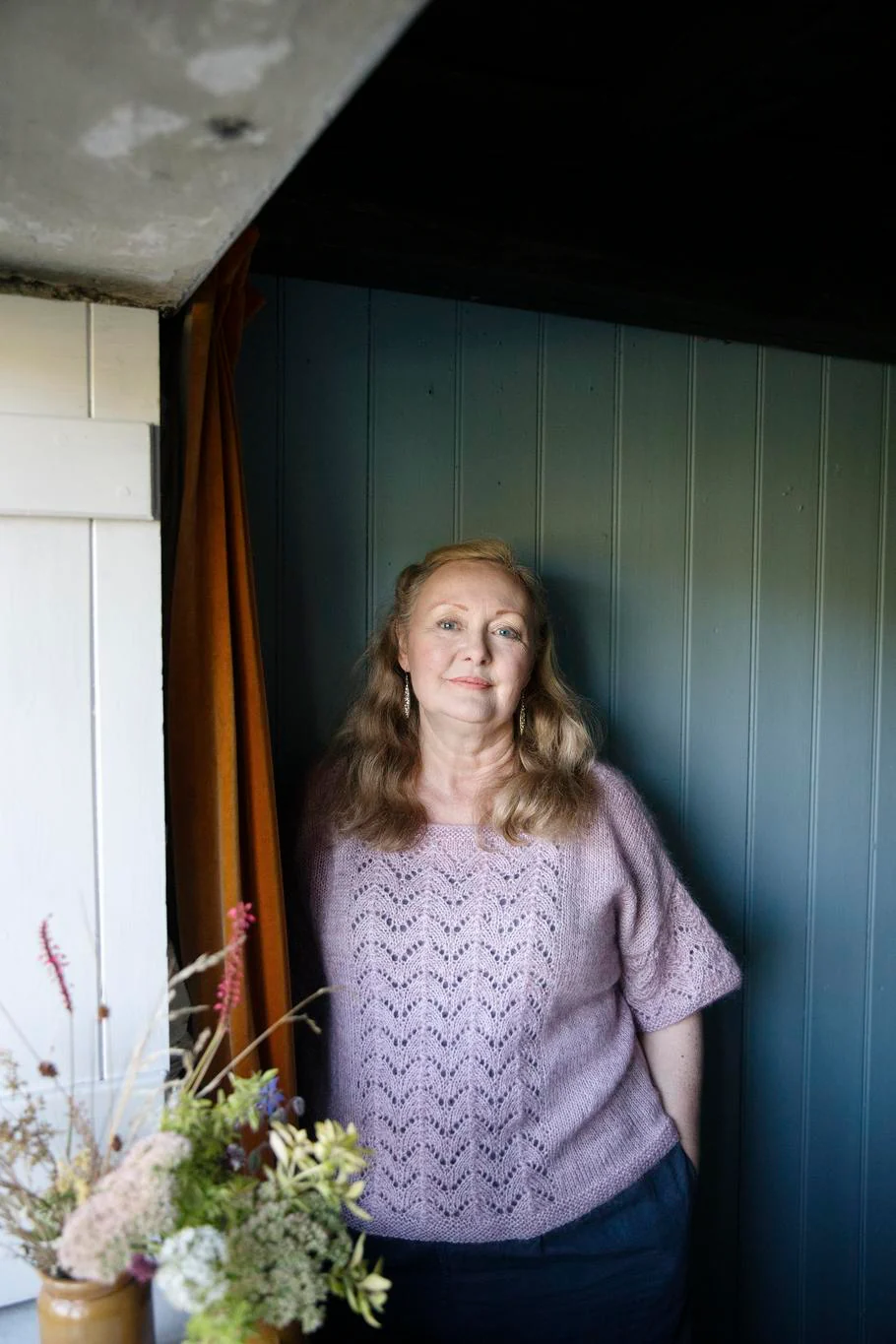 Garnett is a floaty, diaphanous top with a softly curving neckline and deep dropped shoulders. It is worked with large needles and two fine yarns held together, creating a delightful open texture. A lace panel is worked up the front and on both sleeves. The top is knit from the bottom up, first in the round and then the front and back separately. The top was inspired by the artisan and businesswoman Annie Garnett, whose experimental fabrics were some of the first to have metals woven through them. Garnett is knitted with two strands of different fibres to mimic, in a simple way, these innovative techniques.