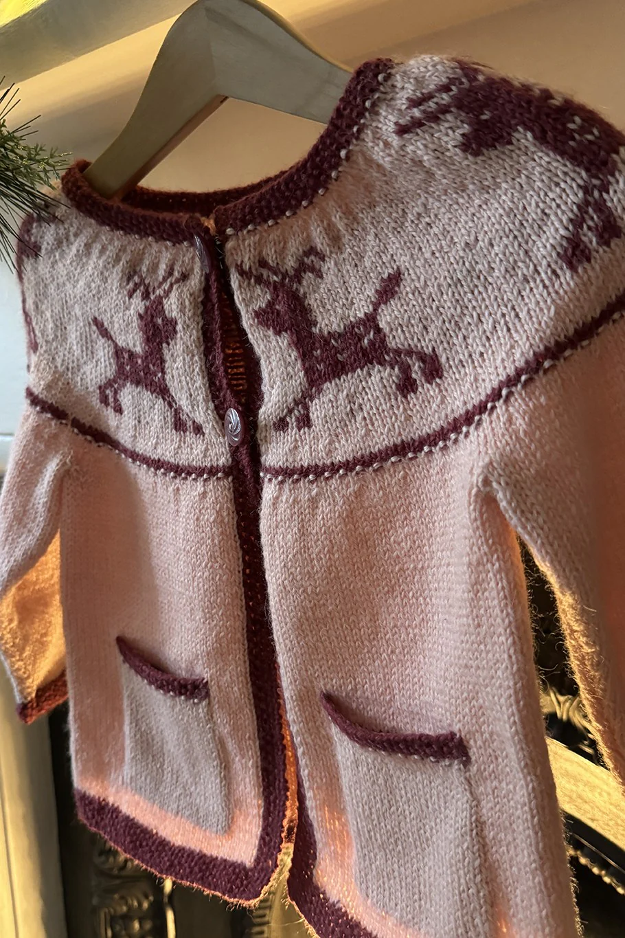 The Junior Christmas Cardigan is knitted in [link: Excelana North fingering weight=:=/collections/excelana-4-ply :link], a soft, yet durable yarn which is perfect for colourwork, and uses two contrasting shades. Our sample has been knitted using [link: French Rose=:=/products/french-rose :link] as the main shade with [link: Ruby Red=:=/products/excelana-ruby-red :link] as the contrast.