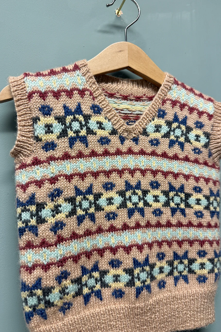 The Junior Wartime Farm Sleeveless Pullover is perfect for the little ones in your life. It is a mini version of the ever-popular Wartime Farm Sleeveless Pullover which appeared on the BBC TV programme The Wartime Farm. This delightful little garment is knitted in the round from the bottom up in all-over stranded colourwork (also known as Fair Isle knitting) up to the underarm. Two options are then provided – the first with instructions to knit the upper body flat in two section: separated into front and back sections which are worked back and forth and a second option to knit the upper body in one piece in the round: with steeks added to armholes and front V-neck.