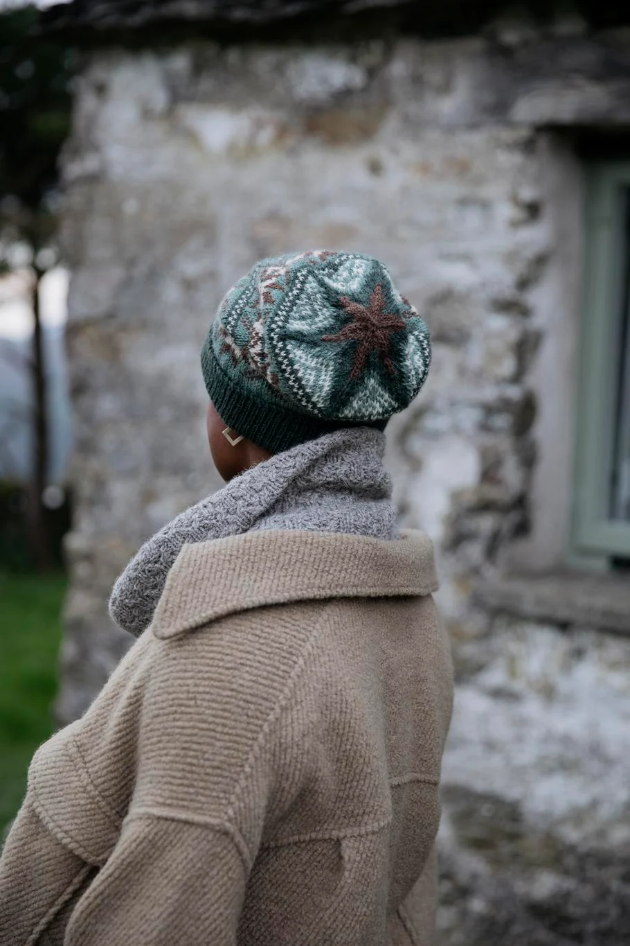 [tab1: Miller is inspired by the photographer Lee Miller, who paved the way for other women photographers to follow her into a male dominated field and used photography to record human experience – both good and bad. Her work can be challenging because of the subject matter but also because of how she was able to capture the raw emotion in any given moment. Miller used light and shadow to create dramatic black and white images. It is this use of dark and light that I have attempted to emulate in the Miller beanie, using the deepest tones of colourways through to the palest, set against a white – or in this case, cream – background to create strong contrast between light and dark. I will never take a photograph to rival one of Miller’s, but can always seek to learn from her and hope that she would appreciate my attempts to do so in the hat dedicated to her. Miller is a slouchy beanie with an eye-catching colourwork pattern. It can be knitted with either a single thickness brim or a deep, double-layered brim for added warmth. The pattern can also be used for either fingering or sport weight yarns making it a very versatile pattern. It is knitted from the brim upwards to the crown and is worked in the round.