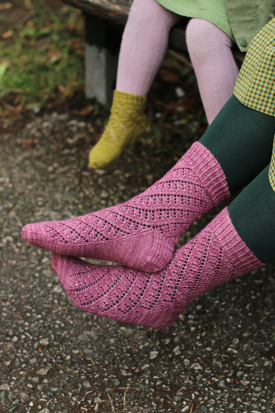 Susan is wearing the fifth size socks in the photographs in shade Thistle Head and Willa is wearing the second size sock in shade Moss Covered Wall.