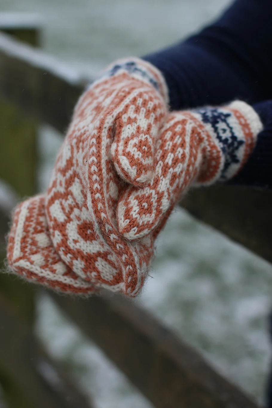 The mittens are knitted in Susan Crawford Excelana DK weight wool, a robust yet soft yarn perfect for colour work mitten knitting. They are knitted in the round from the cuff up. Four sizes are achieved by matching gauge to that for the appropriate size mittens and charted instructions are provided.