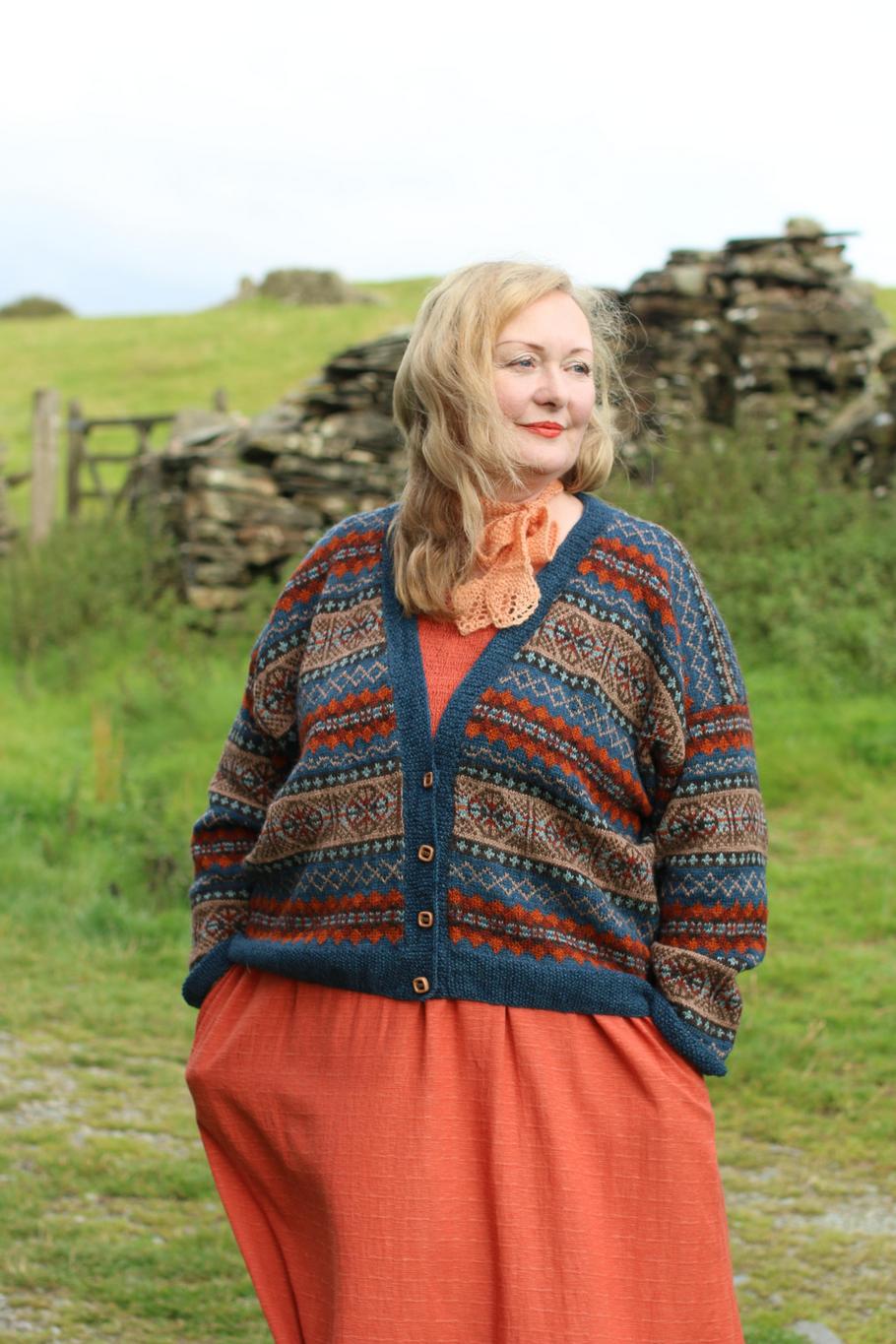 The Vita cardigan embraces this vision of an English country garden: the variety of colours mixed with methodical planting schemes. It is a long-line, drop-shouldered cardigan, featuring the same stranded colourwork pattern as the [productlink: Gertrude vest = pattern-gertrude :productlink]. Vita comes in two lengths: a cosy cropped version and a snuggly long version with inset pockets. The cardigan is knitted in the round from the bottom up. A centre front steek is worked throughout with additional armhole steeks added. The pattern was inspired by the author and poet Vita Sackville-West who, along with her husband, created stunning gardens in Sissinghurst Castle where they lived.