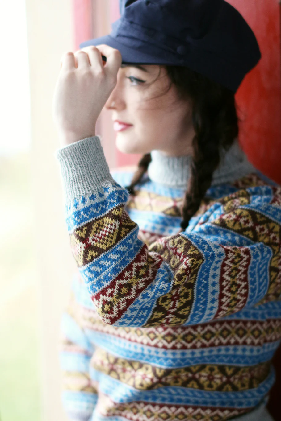 Yule is knitted using Fenella, my 2 ply vintage weight yarn, in six shades, and which perfectly recreates the gauge and finish of the original sweater.